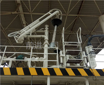密閉式頂部裝卸臂由5個旋轉接組成回轉**,液相4個,氣相1個。氣相一般為DN50,液相根據客戶需要的流量選擇。氣相在轉接處使用金屬軟管連接,保證鶴管的旋轉靈活性。鶴管液相接口朝下,氣相接口朝上,一般氣相會多臺匯總在一個主管上,如果單臺排空的話,需要加帶雨帽的阻火器,**管道進入點燃源。垂管上有一個錐形密封帽,裝車時垂管插到槽車的頂部灌口,密封帽壓實在灌口處,鎖緊外臂鎖緊桿(或者氣缸壓緊,在和油氣回收配合使用時,建議鶴管增加氣缸,達到充分密閉的作用,因為空的槽車在裝車時物料逐漸增多,槽車輪胎壓扁,槽車降低,密封帽就不能很好的密封了,必須有氣缸對密封帽有一個壓力,才能使密封帽始終跟緊灌口。達到有效密閉的效果,油氣回收需要密閉效果達到90%-95%)密封帽密閉后,槽車里氣化的介質就能通過鶴管上的氣相管道排空或者抽入油氣回收系統