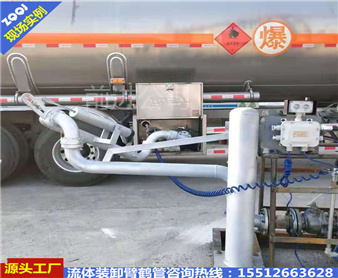 *典型的槽車底部裝卸鶴管,與槽車用快速接頭或者法蘭聯(lián)接,采用五個旋轉(zhuǎn)接頭。介質(zhì)由槽車卸油口經(jīng)鶴管自上而下流入管線內(nèi),采用重力作用下的自流方式就可卸車,接口高度較高時